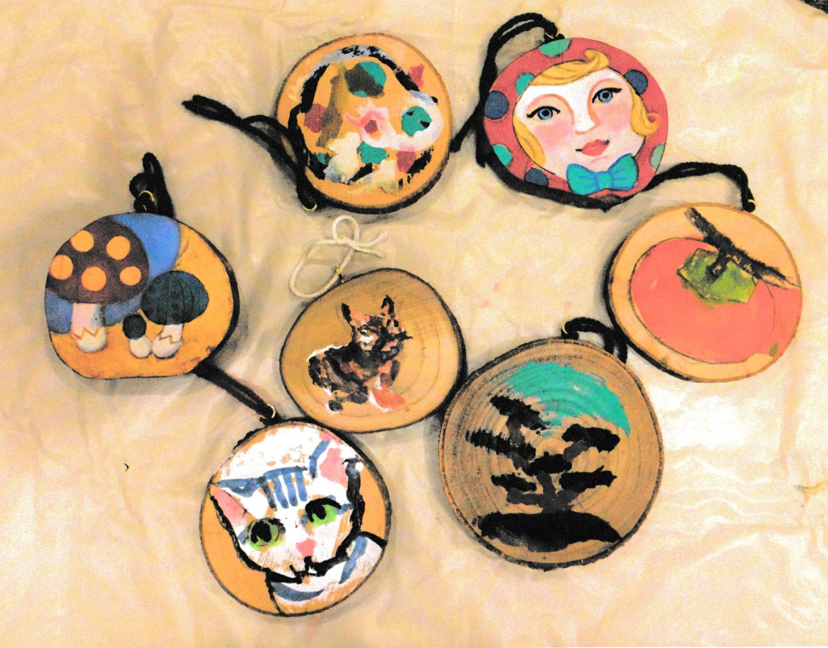 チーム鶴亀 木片に絵をかいてみる。